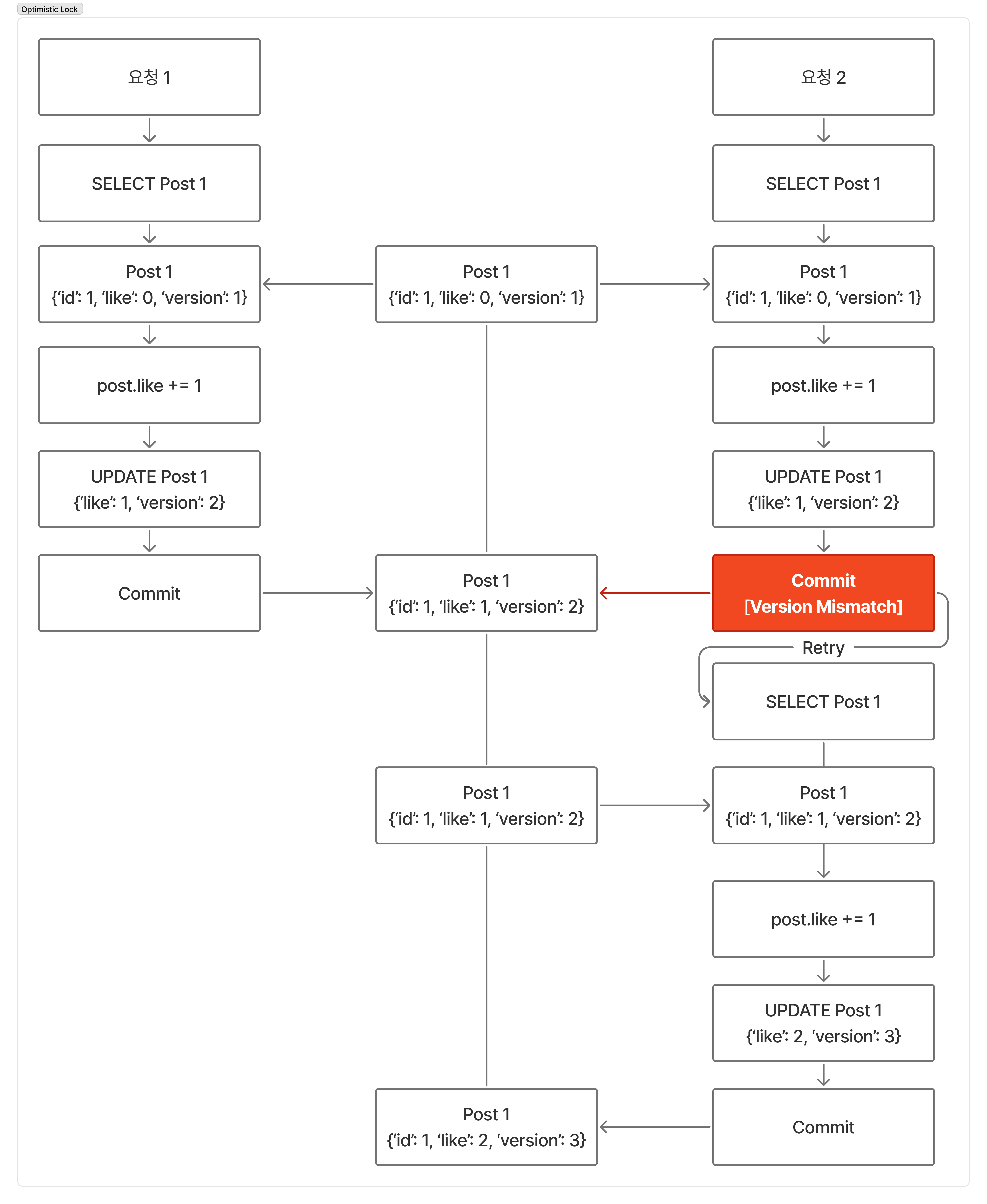 각 요청에서 동시에 데이터를 가져온 후 "좋아요"를 증가시키고 커밋하는 것은 동일하지만,