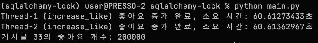 Pessimistic Lock을 사용한 경우 게시글의 "좋아요"를 100,000개 증가시키는 데에 약 60초 가량이 걸렸다.
