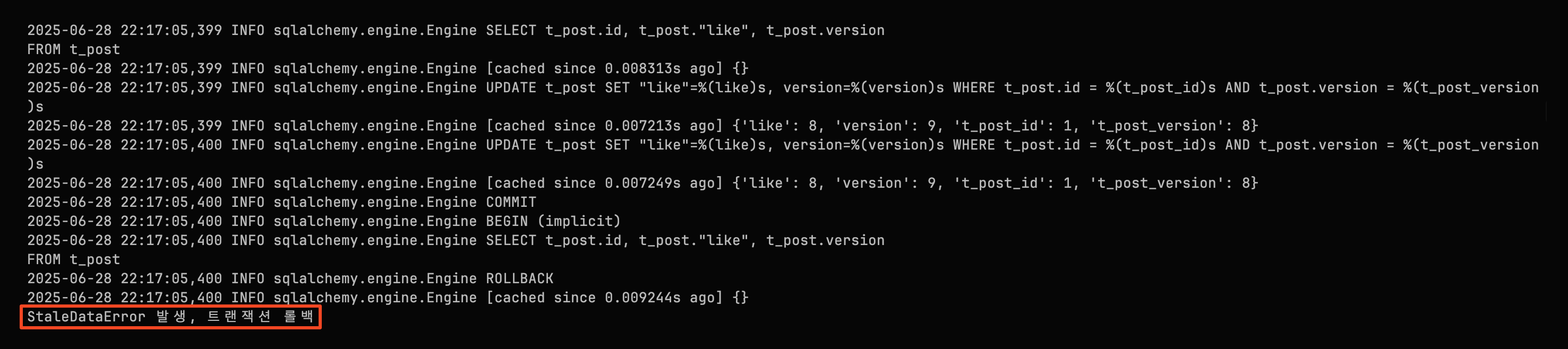 SQLAlchemy가 생성한 쿼리를 확인해보면 SELECT 시 version을 함께 불러오고 UPDATE 시 WHERE 절을 이용해 PK와 version으로 데이터를 찾아서 업데이트하는 것을 알 수 있다.