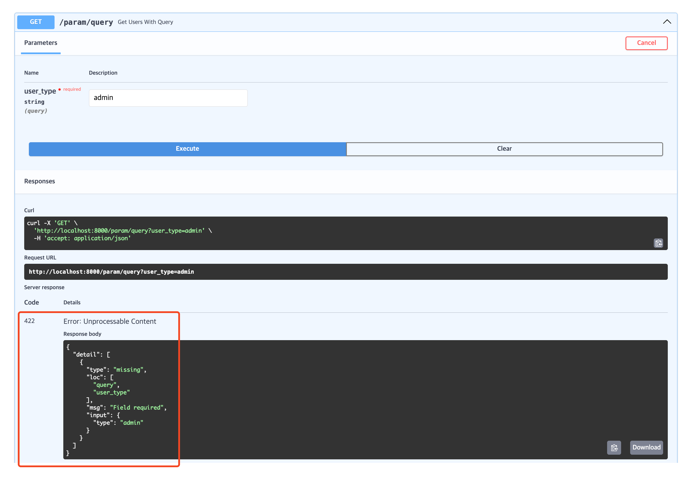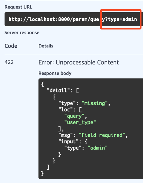이 상태로 Swagger에서 서버에 요청을 보내보면 "type"으로 요청을 보내기 때문에 422 Unprocessable Content 에러가 발생한다.